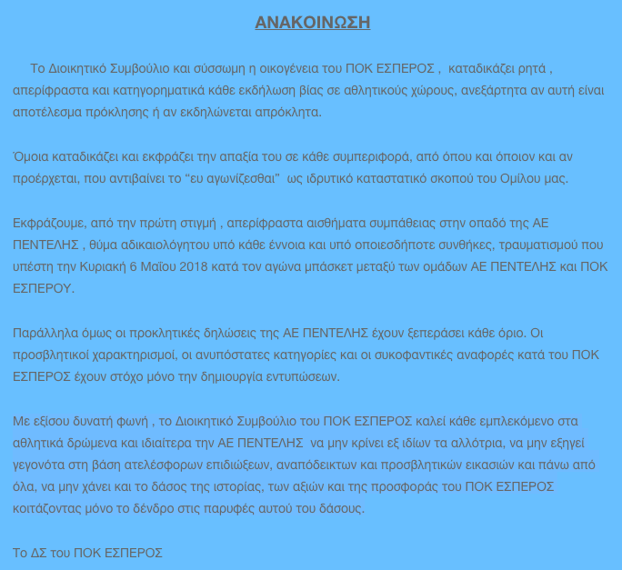 Τη δική του απάντηση προς τις κατηγορίες εναντίον του για τα συμβάντα στο μεταξύ τους ντέρμπι έδωσε ο Έσπερος Καλλιθέας, που καταδίκασε τη «σύρραξη» που έστειλε στο νοσοκομείο φίλαθλο της Πεντέλης, αλλά παράλληλα μίλησε για προσβλητικότητα από την πλευρά της ομάδας των Βορείων προαστίων, που τον «έδειξε» ουκ ολίγες φορές ως υπαίτιο όσων έγιναν.