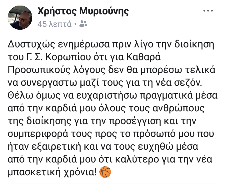 «Δυστυχώς ενημέρωσα πριν λίγο την διοίκηση του Γ. Σ. Κορωπίου ότι για Καθαρά Προσωπικούς λόγους δεν θα μπορέσω τελικά να συνεργαστώ μαζί τους για τη νέα σεζόν. Θέλω όμως να ευχαριστήσω πραγματικά μέσα από την καρδιά μου όλους τους ανθρώπους της διοίκησης για την προσέγγιση και την συμπεριφορά τους προς το πρόσωπό μου που ήταν εξαιρετική και να τους ευχηθώ μέσα από την καρδιά μου ότι καλύτερο για την νέα μπασκετική χρόνια!»