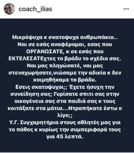 «Μικρόψυχα και σκατόψυχα ανθρωπάκια... Ναι σε εσάς αναφέρομαι, εσάς που ΟΡΓΑΝΩΣΑΤΕ και σε εσάς που ΕΚΤΕΛΕΣΑΤΕ χθες το βράδυ το σχέδιό σας. Ναι μας πληγώσατε, ναι μας στεναχωρήσατε, νιώσαμε την αδικία και δεν κοιμηθήκαμε το βράδυ. Εσείς σκατόψυχοι; Έχετε ήσυχη την συνείδησή σας; Γυρίσατε σπίτι σας, στην οικογένειά σας, στα παιδιά σας και τους κοιτάξατε στα μάτια... Ντραπήκατε έστω και λίγο;