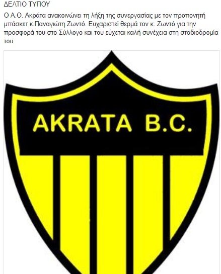 «Ο Α.Ο. Ακράτα ανακοινώνει τη λήξη της συνεργασίας με τον προπονητή μπάσκετ κ.Παναγιώτη Ζωντό. Ευχαριστεί θερμά τον κ. Ζωντό για την προσφορά του στο Σύλλογο και του εύχεται καλή συνέχεια στη σταδιοδρομία του».