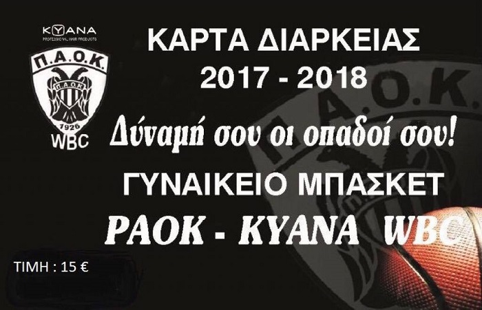 Η ανακοίνωση: «Ξεκίνησε η διάθεση των εισιτηρίων διαρκείας της νέας περιόδου 2017-2018 για το Τμήμα Μπάσκετ Γυναικών ΠΑΟΚ ΚΥΑΝΑ. Το τμήμα έχει προχωρήσει σε αξιόλογες μεταγραφές, ενώ παρέμεινε αναλλοίωτος και ο βασικός κορμός από την περσινή περίοδο. Η Διοίκηση από την πλευρά της έκανε το καλύτερο δυνατό και πλέον χρέος όλων μας είναι να στηρίξουμε την ομάδα σε αυτή την προσπάθεια.
