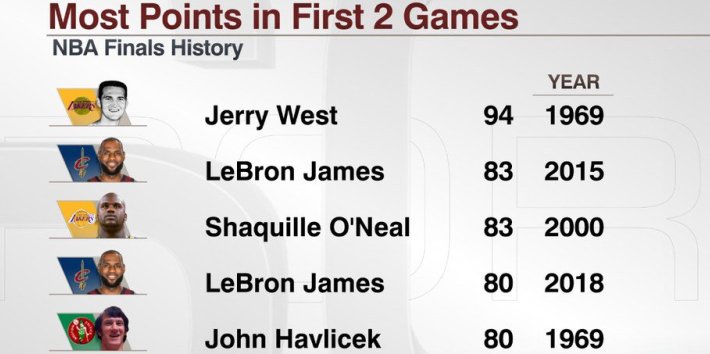 Οι «Καβς» έχασαν και στο δεύτερο τελικό των φετινών πλέι οφ του ΝΒΑ από τους Γκόλντεν Στέιτ Ουόριορς και υπολείπονται πλέον με 2-0. Ο «βασιλιάς» με τους 29π. που πέτυχε έφθασε τους 1.327 πόντους στους τελικούς και ανέβηκε στη δεύτερη θέση της σχετικής λίστας, αφήνοντας πίσω του τον Καρίμ Αμπντούλ-Τζαμπάρ με 1.317π. Πρώτος σκόρερ στους τελικούς, όλων των εποχών, στο ΝΒΑ είναι μακράν ο Τζέρι Ουέστ, με 1.679π.