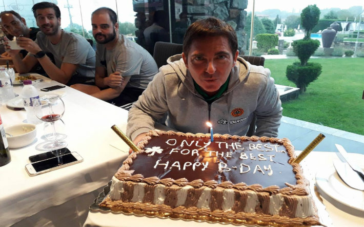Μετά το γεύμα των "πρασίνων", μια τούρτα επικών διαστάσεων έκανε την εμφάνισή της και φυσικά ακούστηκε και το "Happy birthday" προς τιμήν του 45χρονου, πλέον, Καταλανού τεχνικού.