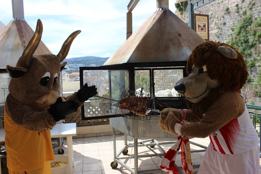 Οι δύο μασκότ έβγαλαν φωτογραφίες με μικρούς και μεγάλους θαυμαστές και φυσικά απόλαυσαν τα τοπικά εδέσματα, πίνοντας την παραδοσιακή τσικουδιά.