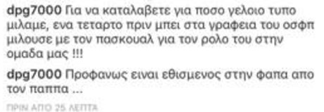Στην φωτογραφία που ανέβασε ο ισχυρός άνδρας της "πράσινης" ΚΑΕ έγραψε: «Τα παντελόνια είναι για τα φορούν άντρες... Εσύ Βαγγελάκη και ο ατζέντης σου ούτε σορτσάκι δεν θα έπρεπε να φοράτε... Φουστίτσες μόνο».