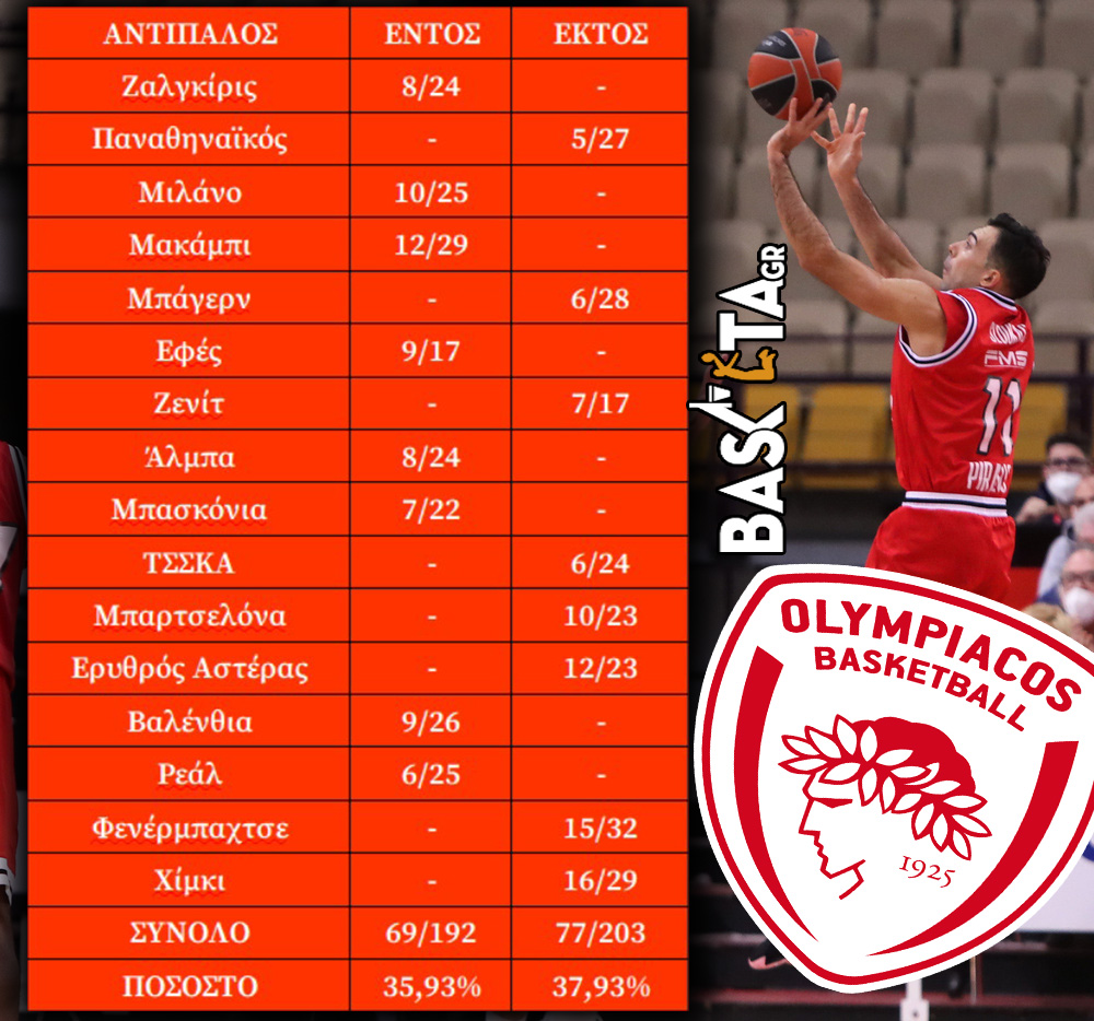 Η αντιπαράθεση των αριθμών του Ολυμπιακού στα τρίποντα στο ΣΕΦ και μακριά από αυτό, έχει ενδιαφέρον...