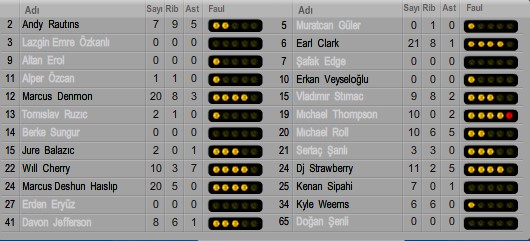 Ο Ερλ Κλαρκ είχε 21 και 11 ριμπάουντ για την Μπεσίκτας, ο Ντι Τζέι Στρόμπερι ακολούθησε με 11 και Τόμπσον - Ρολ είχαν από 10.