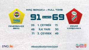 Η Φενέρ ψάχνει μέσα από το πρωτάθλημα ρυθμό και να... ξεσπάσει τον θυμό της για τα αποτελέσματα στην Ευρωλίγκα και τουλάχιστον εκεί παρηγοριέται. Ο Μπούκερ ήταν πρώτος σκόρερ με 17 πόντους, ο Πολονάρα  είχε 15 όσους και ο Χαζέρ, ο Μαχμούτογλου 12, ο Ντουβερίογλου 10, ο Μπιρσέν 8, ο Ακπινάρ 5 και από 3 οι Χένρι, Σαγιόκ και Πιέρ.