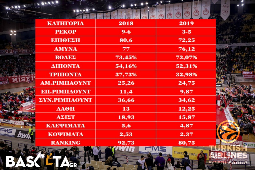 Η σύγκριση των αριθμών της ομάδας του Μπλατ ως προς την Ευρωλίγκα, από το 2018 στο 2019, εμφανίζει χειρότερη αυτή της νέας χρονιάς ακόμη στις βολές, σε όλες τις κατηγορίες των ριμπάουντ, στα κλεψίματα και στα κοψίματα. Κάπως έτσι προκύπτει και η πτώση σχεδόν 12 μονάδων στο ranking, αφού καλύτερος είναι μόνο στην άμυνα και στα λάθη, με οριακό μάλιστα τρόπο.