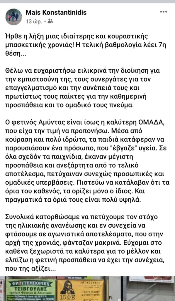 Ο Μάης Κωνσταντινίδης θέλησε να κάνει τον απολογισμό μέσω της προσωπικής του σελίδας, αναφέροντας πως ο φετινός Αμύντας ήταν ίσως η καλύτερη ομάδα που είχε την τιμή να προπονήσει.
