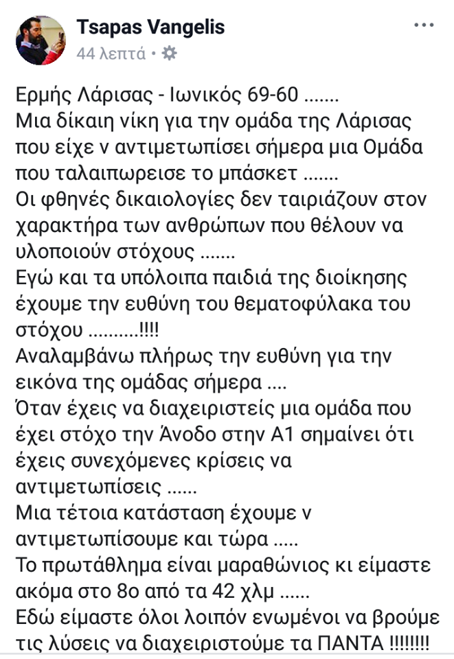 Ο Ιωνικός Νικαίας γνώρισε την πρώτη του ήττα, αλλά ο ισχυρός άνδρας του, Βαγγέλης Τσάπας δεν κρύφτηκε, και έτσι μέσω της προσωπικής του σελίδας τοποθετήθηκε.