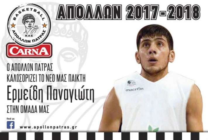 Η διοίκηση του Απόλλωνα Πάτρας Carna ανακοινώνει την έναρξη της συνεργασίας με τον αθλητή Παναγιώτη Ερμείδη. Ο αθλητής (γεν. 1998) έχει ύψος 1.90 μέτρα και αγωνίζεται στη θέση guard. Ξεκίνησε το μπάσκετ από τον Αρίωνα Ξάνθης. Την περσινή σεζόν αγωνίστηκε με την ΧΑΝΘ στο πρωτάθλημα της Β’ Εθνικής/Όμιλος Βορρά (σε 23 παιχνίδια, μ.ο. 7,1 πόντους, 2,3 ριμπάουντ και 1,3 ασίστ με 50,8% δίποντα (31/61), 41,7% στα τρίποντα και 75% στις βολές).