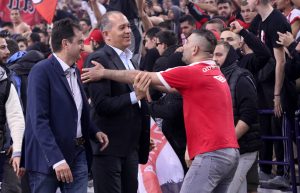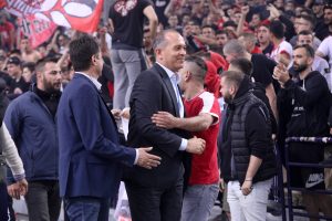 Περίπου ένα λεπτό πριν το τέλος της αναμέτρησης με τον Προμηθέα Πάτρας, οι πρόεδροι του Ολυμπιακού, Γιώργος και Παναγιώτης Αγγελόπουλος, σηκώθηκαν από τις court side θέσεις που βρίσκονταν και κατευθύνθηκαν προς τα αποδυτήρια της ομάδας.