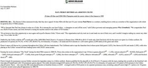 Ο Πολ Πιρς επέστρεψε στους Μπόστον Σέλτικς, όχι για να αγωνιστεί στο νέο πρωτάθλημα του ΝΒΑ, αλλά για αποσυρθεί όπως του αρμόζει από την ενεργό δράση.