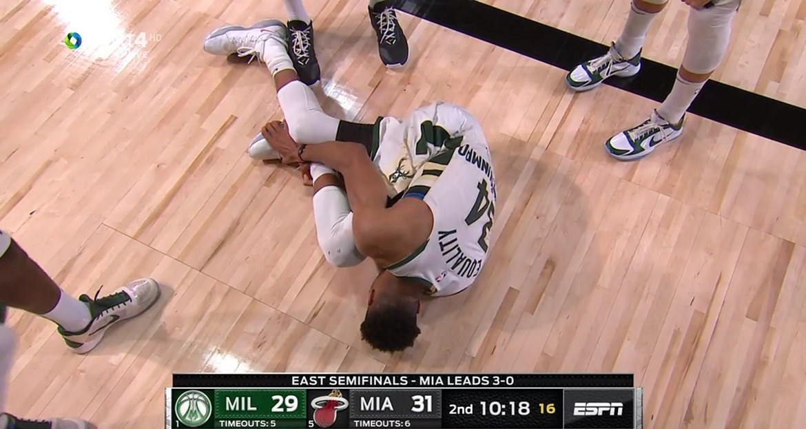 Οι Μιλγουόκι Μπακς έδειχναν να επιστρέφουν στο παιχνίδι με τον Γιάννη Αντετοκούνμπο να κυριαρχεί. Στο 14' του αγώνα με το σκορ στο 29-31 για το Μαϊάμι ο Greek Freak δεν πάτησε καλά πηγαίνοντας προς το καλάθι και έπεσε φωνάζοντας από τον πόνο.