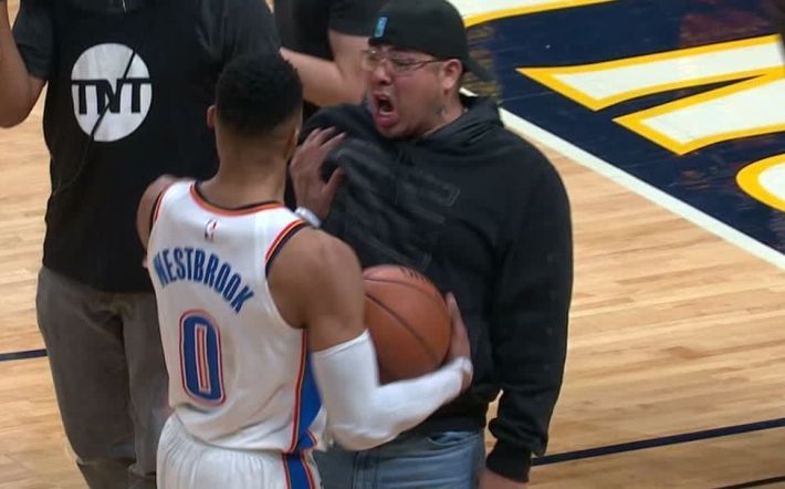 O 29χρονος γκαρντ αντέδρασε έντονα όταν οπαδός των γηπεδούχων ξέφυγε από τις κερκίδες, βρέθηκε στο παρκέ και του φώναξε μπροστά στο πρόσωπο αμέσως μετά τη λήξη του αγώνα στο «Pepsi Center». Ο Ράσελ Ουέστμπρουκ φανερά δυσανασχέτησε, αλλά δεν έμεινε εκεί. Τον απώθησε και προκάλεσε αλγεινές εντυπώσεις, κι ας μην προκάλεσε ο ίδιος το περιστατικό. Αμέσως, πάντως, οι συμπαίκτες του και οι διαιτητές έσπευσαν στο σημείο, ώστε να επιβεβαιωθούν πως το σκηνικό δεν θα πάρει έκταση, ενώ ο φίλαθλος απομακρύνθηκε άρον άρον από τους ανθρώπους ασφαλείας του γηπέδου. Το κακό, βέβαια, είχε ήδη γίνει...