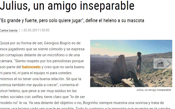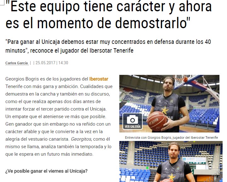 «Ο Γιώργος Μπόγρης είναι ένας από τους παίκτες της Ιμπεροστάρ Τενερίφε που έχει το πιο μαχητικό πνεύμα και τη μεγαλύτερη φιλοδοξία. Χαρακτηριστικά που δείχνει στο παρκέ, αλλά και στις δηλώσεις που έκανε και μετά το 1-0 της Μάλαγα, λέγοντας πως πιστεύει πως η ομάδα μπορεί να οδηγήσει τη σειρά σε τρίτο αγώνα. Μια ισοφάριση, την οποία  ο Αθηναίος βλέπει κάτι παραπάνω από πιθανή. Γενημένος νικητής με καταδεκτικό χαρακτήρα που τον μετατρέπει σε θετική επίδραση στα αποδυτήρια των Καναρίων. Ο Georgitos, όπως τον αποκαλούν, αναλύει τη χρονιά και αυτά που περιμένει στο άμεσο μέλλον.