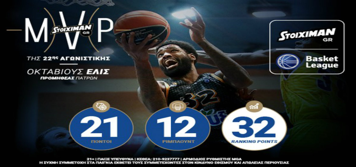 Ο Προμηθέας Πατρών παρέμεινε σε θέση φαβορί για το πλεονέκτημα έδρας μετά και το εμφατικό «διπλό» στη Ρόδο, με τον MVP της 22ης αγωνιστικής της Stoiximan.gr Basket League, Οκτάβιους Έλις, να αφήνει το δικό του «στίγμα» για συμμετοχή στην Ευρώπη του χρόνου.