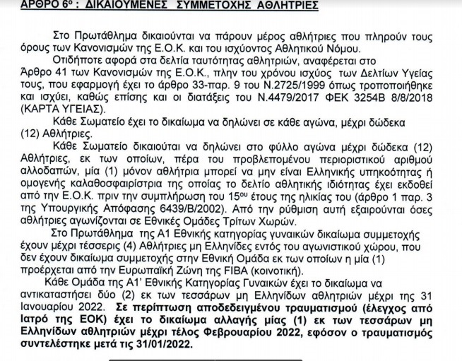 Αλλαγές έρχονται στο πρωτάθλημα της Α1 Γυναικών σε ότι αφορά των αριθμό συμμετοχής των ξένων αθλητριών. Σύμφωνα με την νέα προκύρηξη που εξέδωσε η ΕΟΚ, δικαίωμα συμμετοχής θα έχουν πλέον τέσσερις μη Ελληνίδες παίκτριες.