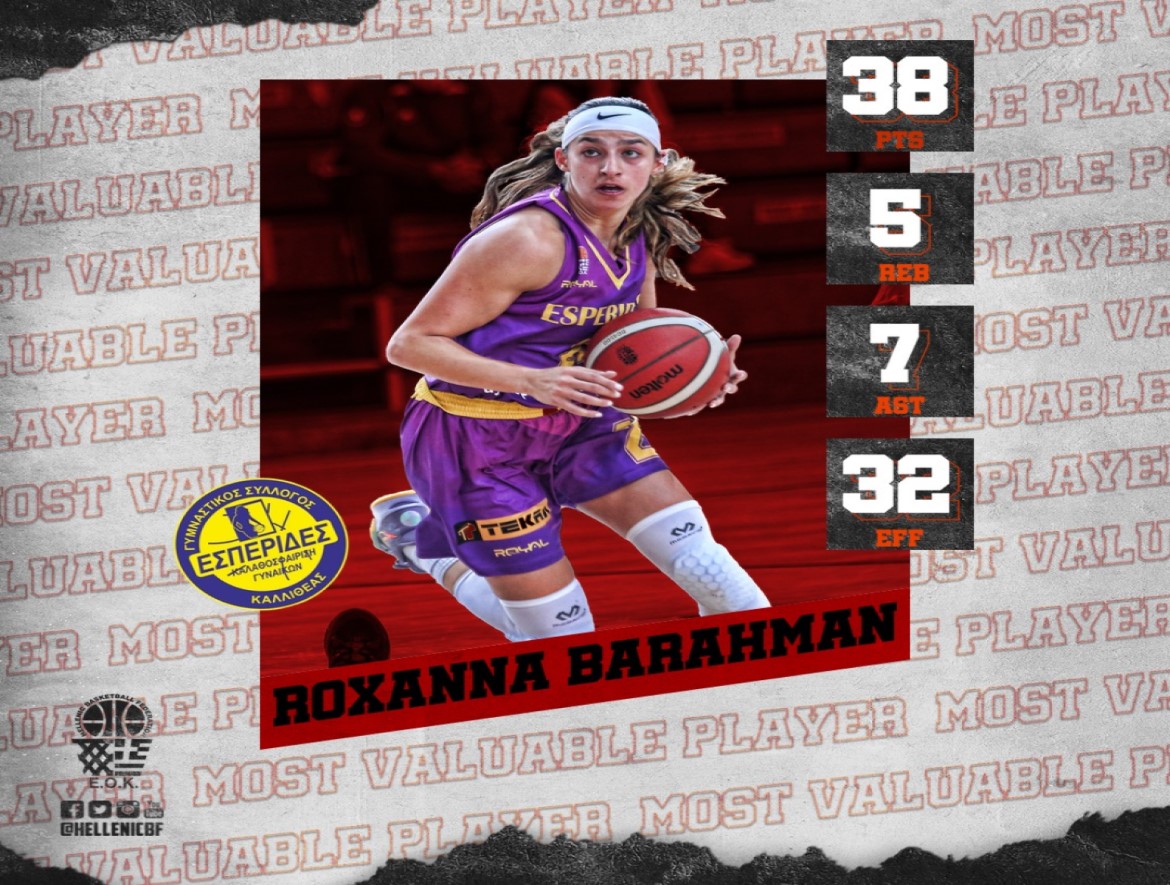 Τον τίτλο της πολυτιμότερης παίκτριας της 3ης αγωνιστικής του πρωταθλήματος της Α1 Γυναικών κέρδισε η Ροξάνα Μπάραμαν από τις Εσπερίδες. Στην αναμέτρηση απέναντι στη Δάφνη Αγίου Δημητρίου, σημείωσε 38 πόντους, μάζεψε 5 ριμπάουντ, μοίρασε 7 ασίστ, συγκέντρωσε 32 μονάδες στο σύστημα αξιολόγησης και αναδείχθηκε MVP.