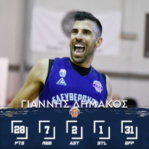 Ο Γιάννης Δημάκος βοήθησε την Ελευθερούπολη να επικρατήσει του Ψυχικού εκτός έδρας με 28 πόντους, επτά ριμπάουντ, δύσο ασίστ, ένα κλέψιμο και 31 στο σύστημα αξιολόγησης.