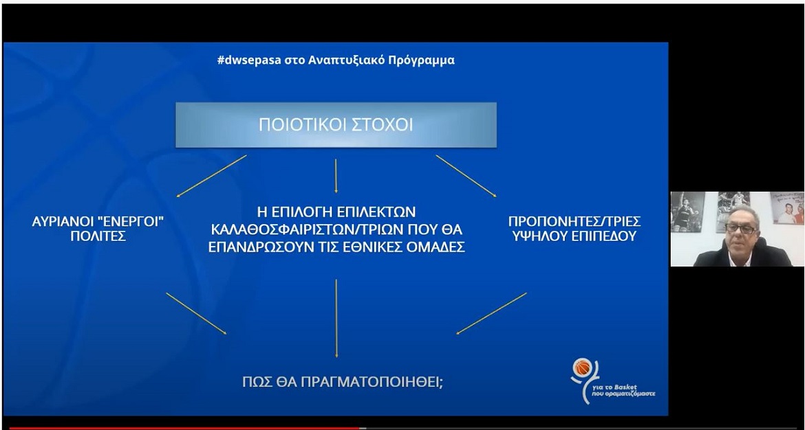 Στο Zoom Conference έγινε εκτενής αναφορά στα αποτελέσματα της υπάρχουσας αναπτυξιακής διαδικασίας και κατατέθηκε ένα λεπτομερές πλάνο παρεμβάσεων, δίνοντας λόγο σε όλους τους ανθρώπους της μπασκετικής κοινότητας και όλους τους επιστημονικούς κλάδους που συναντώνται σε αυτή, ώστε να δημιουργηθεί η Ελληνική Σχολή Μπάσκετ, με ξεκάθαρες αρχές και κατευθύνσεις, όπως αυτές θα αποτυπώνονται στο “playbook” που θα δημιουργηθεί, για όλα τα εμπλεκόμενα μέρη.