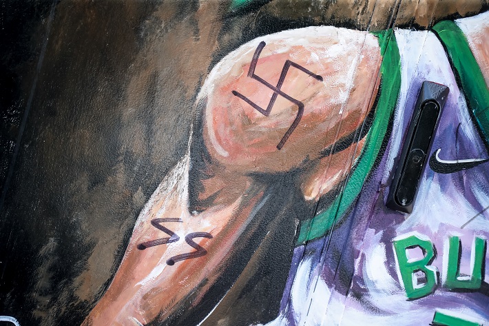 Η ταυτότητά τους γίνεται σαφής από τα σύμβολα που επέλεξαν για να χαλάσουν το ωραίο δημιούργημα, μια σβάστικα και το σήμα τω ες - ες. Δεν είναι η πρώτη φορά που ο παγκοσμίου φήμης Ελληνας σταρ του αθλητισμού δέχεται τέτοιου είδους "επιθέσεις", αλλά ούτε και ο μοναδικός αφού είχε συμβεί πριν λίγο καιρό βανδαλισμός και σε μια απεικόνιση του Νίκου Γκάλη.