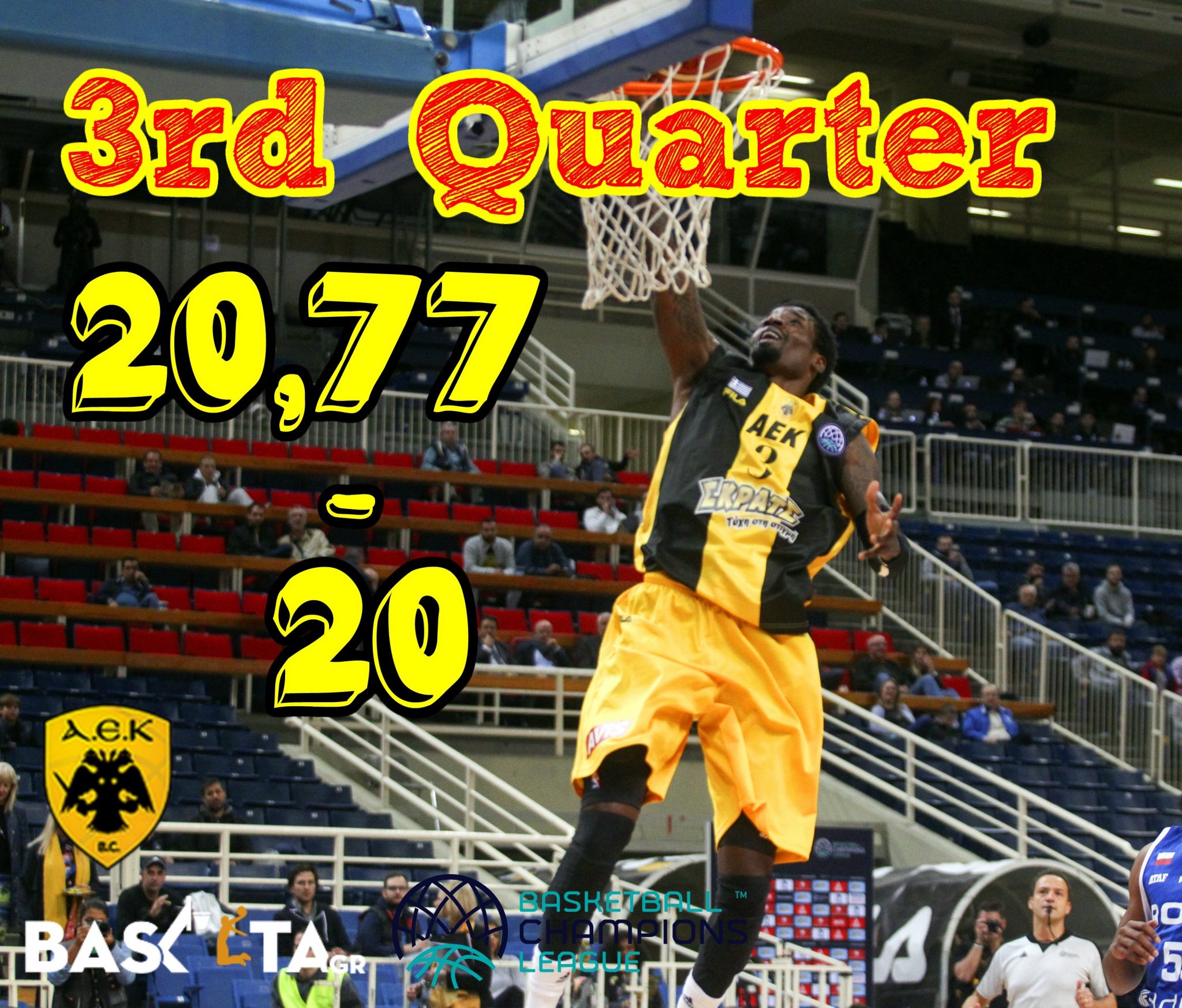 Θετικό πρόσημο βγάζει και η 3η περίοδος αλλά επίσης με οριακό τρόπο για την ΑΕΚ αφού σημείωσε 374 πόντους και δέχτηκε 360. Η διαφορά των 14 πόντων σε 18 παιχνίδια είναι προφανώς ελάχιστη. Επτά φορές το επιμέρους σκορ ήταν υπέρ της ΑΕΚ, έξι φορές εις βάρος της ενώ αρκετά μεγάλο ήταν το ποσοστό των ισοπαλιών αφού πέντε από τα τρίτα δεκάλεπτα, έβγαλαν τέτοιο αποτέλεσμα. Εντός έδρας με Εστουδιάντες (17-17), Μπάνβιτ (17-17) και εκτός έδρας με Βενέτσια (26-26), Στρασμπούρ στην κανονική περίοδο (18-18) και Μπάνβιτ (20-20).