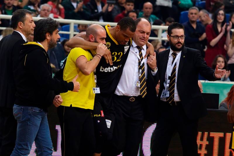 Ο Βινς Χάντερ τραυματίστηκε λίγο πριν το φινάλε του αγώνα του Παναθηναϊκού με αντίπαλο την ΑΕΚ στο ΟΑΚΑ.