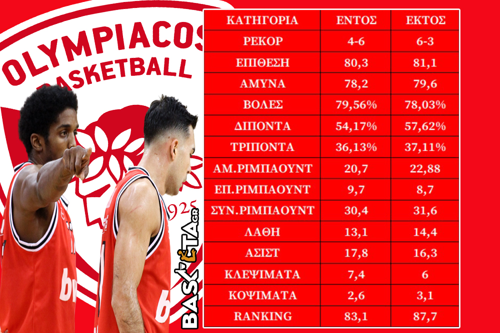 Βάζοντας στην ίδια ζυγαριά τους αριθμούς της ομάδας του Γιώργου Μπαρτζώκα εντός κι εκτός έδρας, διαπιστώνει εύκολα κανείς ότι ο Ολυμπιακός είναι λίγο καλύτερος στις περισσότερες στατιστικές κατηγορίες...