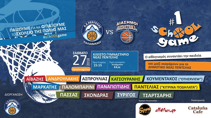 Tο “1ο sChOOL gameείναι γεγονός! Η ομάδα της Α.Ε. Πεντέλης διοργανώνει ένα φιλικό παιχνίδι διαφορετικό από τα άλλα. Το Σάββατο 27 Ιανουαρίου και ώρα 15.15 στο Κλειστό Γυμναστήριο Νέας Πεντέλης οι παλαίμαχοι της πόλης θα αντιμετωπίσουν μία επίλεκτη ομάδα διάσημων απ' όλους τους χώρους με στόχο να παίξουν, να διασκεδάσουν και από κοινού να... σκοράρουν για να υλοποιηθούν κάποιες απαραίτητες εργασίες ανακατασκευής στο Δημοτικό Σχολείο Νέας Πεντέλης.