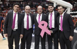 Το τεχνικό επιτελείο της Βαλένθια με τις ροζ γραβάτες του, καθώς η αγωνιστική είναι αφιερωμένη στην ενημέρωση για τον καρκίνο του μαστού.