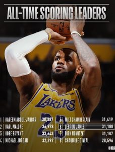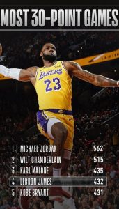 Ιστορία έγραψε και ο «βασιλιάς», που είχε απολογισμό 35π., έντεκα ριμπάουντ, τέσσερις ασίστ, δύο κλεψίματα και τέσσερα λάθη κι ανέβηκε στην έκτη θέση της λίστας των κορυφαίων σκόρερ του ΝΒΑ, ξεπερνώντας τον Ντιρκ Νοβίτσκι, με 31.188π. Πέμπτος είναι ο Ουίλτ Τσάμπερλεϊν, με 31.419 πόντους. Παράλληλα, έγινε ο τέταρτος παίκτης με τις περισσότερες «30άρες». Έχει πλέον 432 και «κυνηγάει» τον Καρλ Μαλόουν, που τελείωσε την καριέρα του με 435.