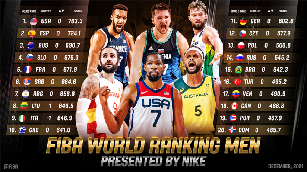 Το παράδοξο στην πρώτη 20άδα είναι ότι υπήρξε μόλις μία μεταβολή, στις θέσεις 8-9 με τη Λιθουανία να προσπερνάει την Ιταλία και... τέλος. Οι ΗΠΑ στην κορυφή, με Ισπανία και Αυστραλία να ακολουθούν συγκροτούν την πρώτη τριάδα, ενώ την πεντάδα συμπληρώνουν οι Σλοβενία και Γαλλία.