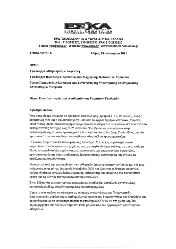 Η ΕΣΚΑ αποτελεί την πρώτη Ένωση που τοποθετείτε, και με επιστολή της ζητάει από την πολιτεία να επανεκτιμήσει την κατάσταση και να επιτρέψει αρχικά την επαναλειτουργία των τμημάτων υποδομών και ακαδημιών έως 12 ετών, και σταδιακά να ξεκινήσει όλη η υπόλοιπο αθλητική δραστηριότητα.