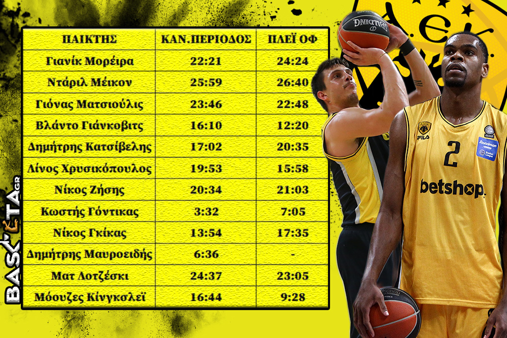 Η σύγκριση των μέσων όρων στους χρόνους συμμετοχής των παικτών της ΑΕΚ από την κανονική περίοδο στα πλέι οφ, έχει ενδιαφέρον...