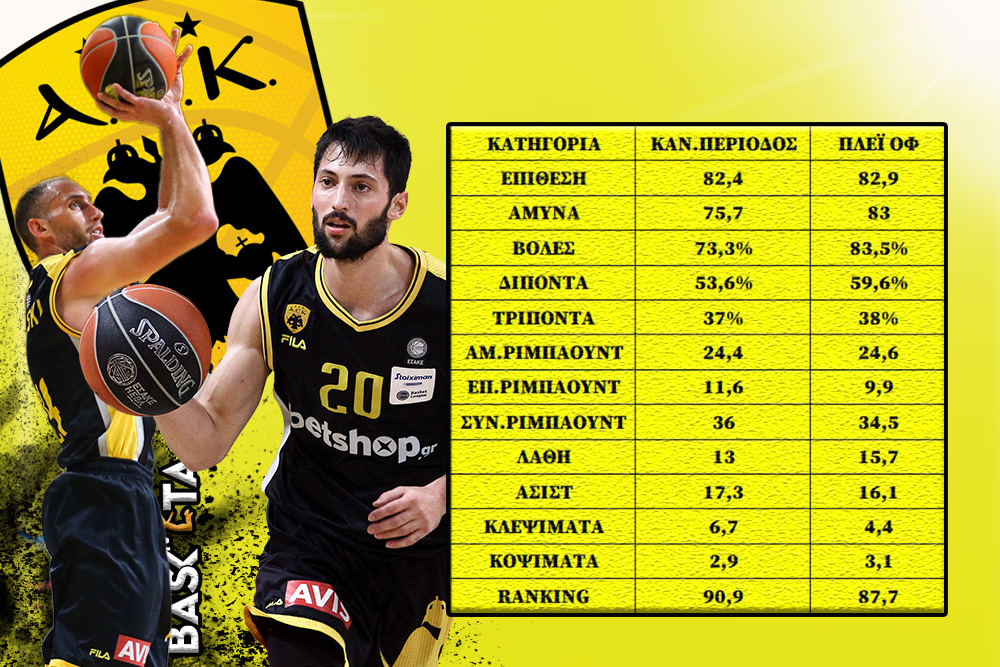 Στα επτά ματς των πλέι οφ, ματς που ήταν μεγάλης κρισιμότητας και με χαρακτήρα ντέρμπι, η ΑΕΚ δεν εμφανίστηκε σε κάποιες κατηγορίες καλύτερη και σε κάποιες χειρότερη σε σχέση με τα 22 της κανονικής περιόδου. Το μεγαλύτερο πρόβλημα της είναι η άμυνα αφού δέχεται 7,3 περισσότερους πόντους ενώ κάνει περισσότερα λάθη. Στον αντίποδα όμως εκτελεί καλύτερα σε όλες τις κατηγορίες των σουτ, ανεβάζοντας μάλιστα κατά 10,2% το ποσοστό της από τη γραμμή του φάουλ...
