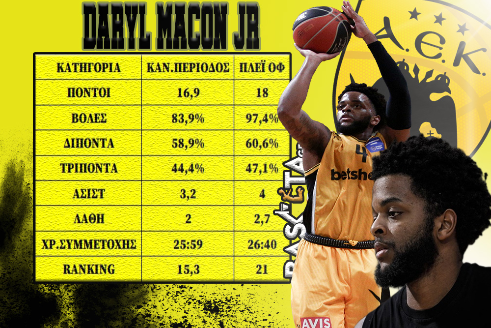 Αυτό που έμοιαζε με μία προφανής λύση του προβλήματος της απουσίας του Λάνγκφορντ, με τον Μέικον να γίνεται αντί-Λάνγκφορντ, δεν το είδαμε. Τουλάχιστον στις σειρές με τον ΠΑΟΚ και τον Παναθηναϊκό. Ο Αμερικανός κατάφερε στα επτά ματς των πλέι οφ να σκοράρει λίγο περισσότερο από τα εννιά που έπαιξε στην κανονική περίοδο, παίρνοντας όμως λιγότερα σουτ. Στην κανονική περίοδο είχε 11,2 προσπάθειες για δίποντο και τρίποντο και στα έξι ματς των πλέι οφ, είχε 9,6 σουτ εντός πεδιάς. Ανέβασε όμως τον μέσο όρο του στο σκοράρισμα, έχοντας παράλληλα υψηλότερα ποσοστά ευστοχίας, χωρίς να παίζει επί της ουσίας πολύ περισσότερο.