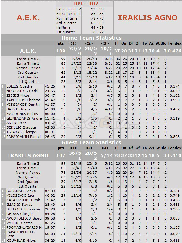 Ήταν από εκείνα τα παιχνίδια που δεν θέλεις να τελειώσουν. Και ήταν σχεδόν ατελείωτο. Μετά το 78-78 της κανονικής διάρκειας, η πρώτη παράταση έληξε με σκορ 7-7 και η δεύτερη με 14-14 για να πάρει η ΑΕΚ τη νίκη με σκορ 10-8 στην τρίτη. Ήταν ένα ματς στο οποίο πέντε παίκτες είχαν 20+ πόντους ενώ ο Λάζαρος Παπαδόπουλος κατάφερε να μείνει στο παρκέ για 50 λεπτά!
