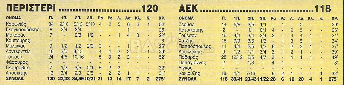 Η ΑΕΚ είχε συμμετοχή σε ματς τριών παρατάσεων και στα πλέι οφ του 1996. Στο τρίτο ματς της πρώτης φάσης, που έκρινε και την πρόκριση, είχε ηττηθεί στο Περιστέρι με 120-118. Ήταν ένα ματς με μία «30άρα», δύο «20άρες» και συνολικά 10 παίκτες με διψήφιο αριθμό πόντων. Αξιοσημείωτο ακόμη ήταν το γεγονός ότι δύο παίκτες του Περιστερίου (Άγγελος Κορωνιός και Μέλβιν Τσίτουμ), έχασαν μόνο τρία από τα 55 λεπτά της συνολικής δράσης!