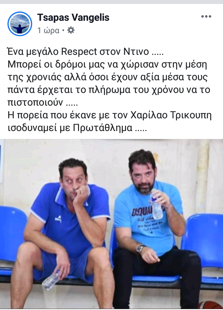 Μέσω της προσωπικής του σελίδας του έβγαλε το καπέλο, για την σπουδαία πορεία που έκανε με τον Χαρίλαο Τρικούπη, ο οποίος θα συμμετάσχει στα πλέι οφς ανόδου.