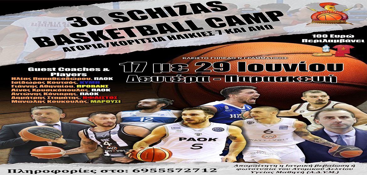 Το SBC "επιστρέφει"! Το 3ο Schizas Basketball Camp "έρχεται" το επόμενο διάστημα στην Σαλαμίνα, πιο εμπλουτισμένο από κάθε άλλη φορά και με αρκετές εκπλήξεις. Πρόκειται να διεξαχθεί το διάστημα 17-29 Ιουνίου (Δευτέρα-Παρασκευή) και θα συμμετέχουν παιδιά ηλικίας από 7 ετών και άνω, τα οποία θα έχουν την δυνατότητα να ζήσουν μια ξεχωριστή εμπειρία αυτό το καλοκαίρι. Αγόρια και κορίτσια θα διδαχτούν τα μυστικά του αθλήματος, θα διασκεδάσουν και θα ευχαριστηθούν το αγαπημένο τους άθλημα, δίπλα σε προπονητές και καλαθοσφαιριστές με εμπειρία στην Α1!