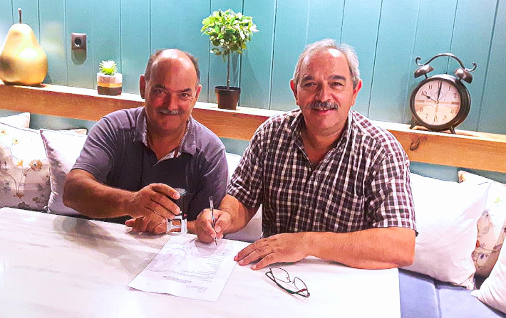 Στην φωτογραφία απεικονίζονται ο πρόεδρος του συλλόγου, Γιώργος Μάτος και ο γενικός γραμματέας, Τάσος Σουλτανόπουλος να υπογράφουν το σχετικό έγγραφό ανόδου.