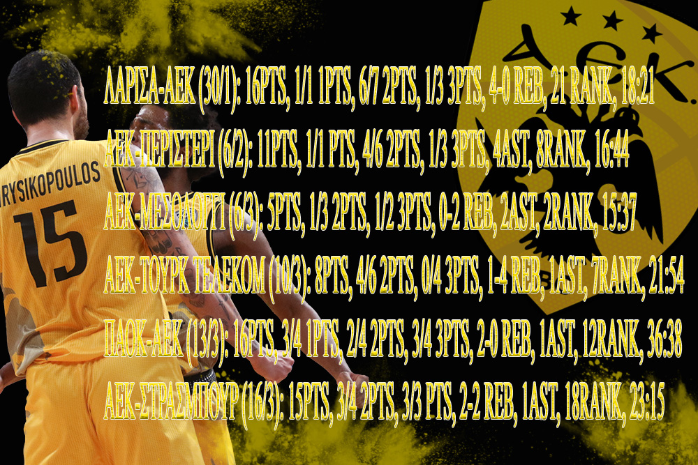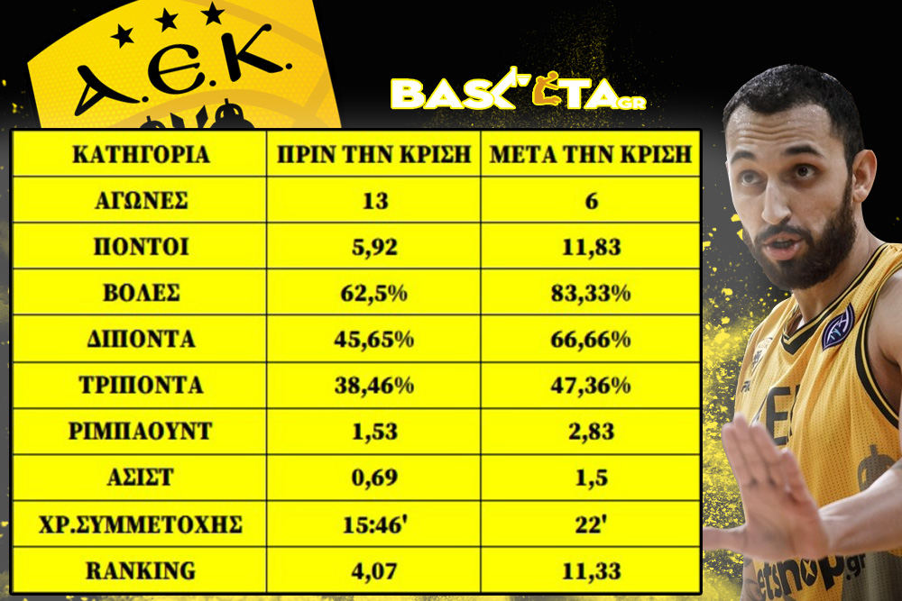 Αυτό προκύπτει από τη σύγκριση των αριθμών του Κερκυραίου πριν και μετά την κρίση που τον εμφάνιζε έτοιμο να βγάλει τη φανέλα της ΑΕΚ και να αναζητήσει αλλού την τύχη του. Μετά από εκείνο το διάστημα ο Χρυσικόπουλος έπαιξε σε έξι ματς Πρωταθλήματος και BCL, με αριθμούς που δείχνουν ότι η τελική απόφαση δικαιώνει τόσο τον ίδιο, όσο βέβαια και την ομάδα του...