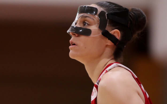 Η Αγγελική Νικολοπούλου είναι παρούσα στον αγώνα Ολυμπιακός - Παναθηναϊκός στο ΣΕΦ. Η γκαρντ του Ολυμπιακού πάτησε παρκέ... αγνώριστη. Ένας τραυματισμός στη μύτη, την υποχρέωσε να αγωνιστεί με προστατευτική μάσκα, στον πρώτο τελικό του πρωταθλήματος της Α1 Γυναικών.