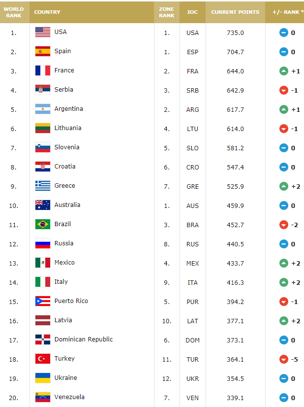 Ακολουθούν η Σερβία και η Αργεντινή, με τη Λιθουανία να είναι έκτη και την πρωταθλήτρια Ευρώπης Σλοβενία έβδομη. Όγδοη είναι η Κροατία, ενώ η δεκάδα ολοκληρώνεται με την Αυστραλία.