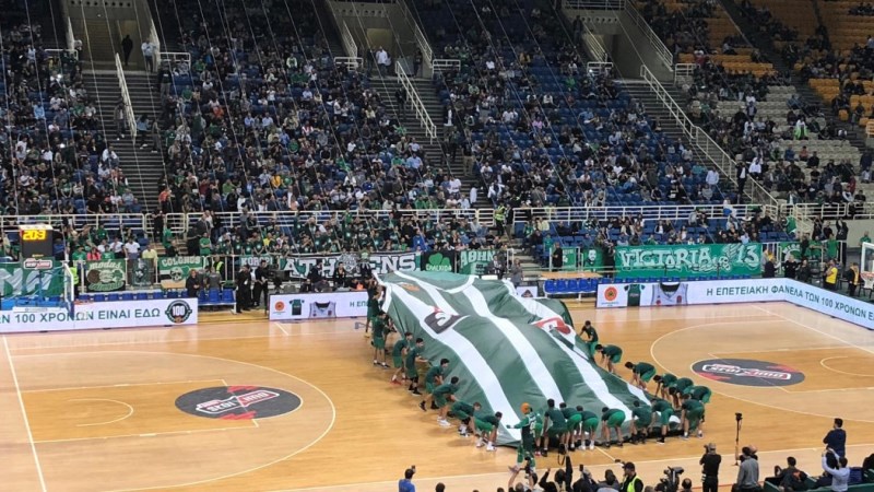 Αθλητές από την Ακαδημία του συλλόγου μπήκαν στο παρκέ και παρουσίασαν την εμφάνιση που είναι καταπράσινη και μπροστά λευκή με πράσινες ρίγες.