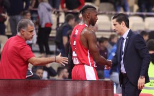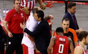 Οι χειραψίες του Γιάννη Σφαιρόπουλου με τους γηπεδούχους, μετά το τέλος του ματς. Θυμίζουμε πως η «ομάδα του λαού» πανηγύρισε τη νίκη με 90-65.