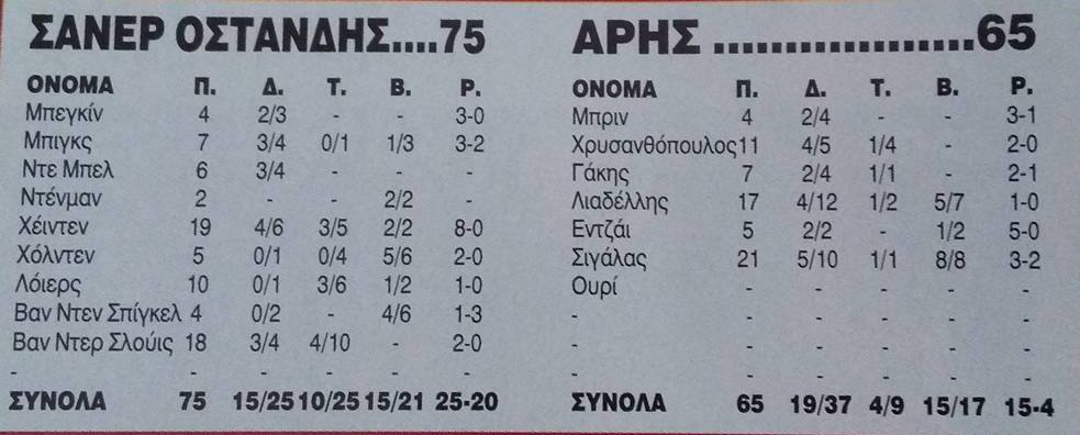 Οι «κίτρινοι» είχαν νικήσει με 115-77 στο Αλεξάνδρειο με τον «γκάνγκστερ» να φτάνει στους 52 πόντους ενώ 20 είχε ο Σούμποτιτς και 17 πόντους ο Τζάκσον, Αμερικανός που αγωνιζόταν μόνο στην Ευρώπη. Στο Βέλγιο ο Άρης ζευγάρωσε τις νίκες του με νέα «100άρα» επικρατώντας με 125-77. Ο Γκάλης σε εκείνο το παιχνίδι είχε 32 πόντους, 20 πρόσθεσε ο Τζάκσον και 16 ο Σούμποτιτς. Στην επόμενη φάση, ακολούθησε η δραματική σειρά με την Τρέισερ Μιλάνο με το +31 στο «Παλέ» αλλά το -34 στην ιταλική πόλη.