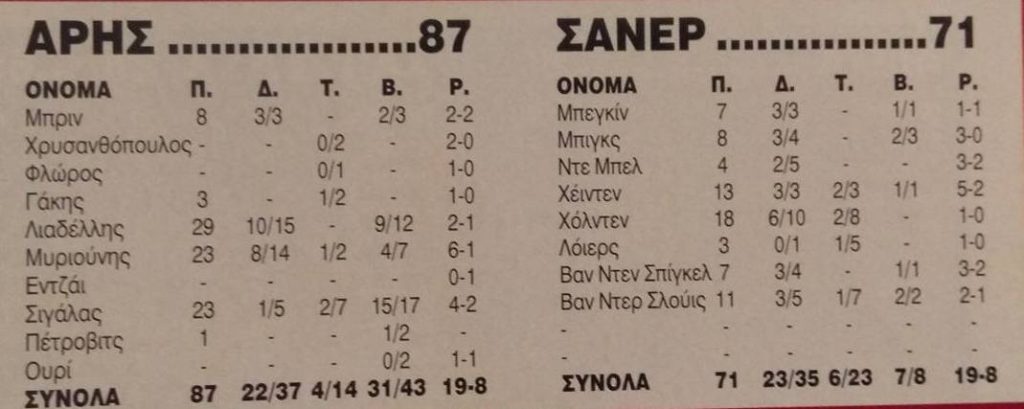 Πιο συγκεκριμένα, για το Κύπελλο Πρωταθλητριών της περιόδου 1986-87, ο Άρης αντιμετώπισε τη Σουνέρ Οστάνδης πέτυχε δύο εύκολες νίκες με τον Νίκο Γκάλη να σημειώνει αθροιστικά 84 πόντους!